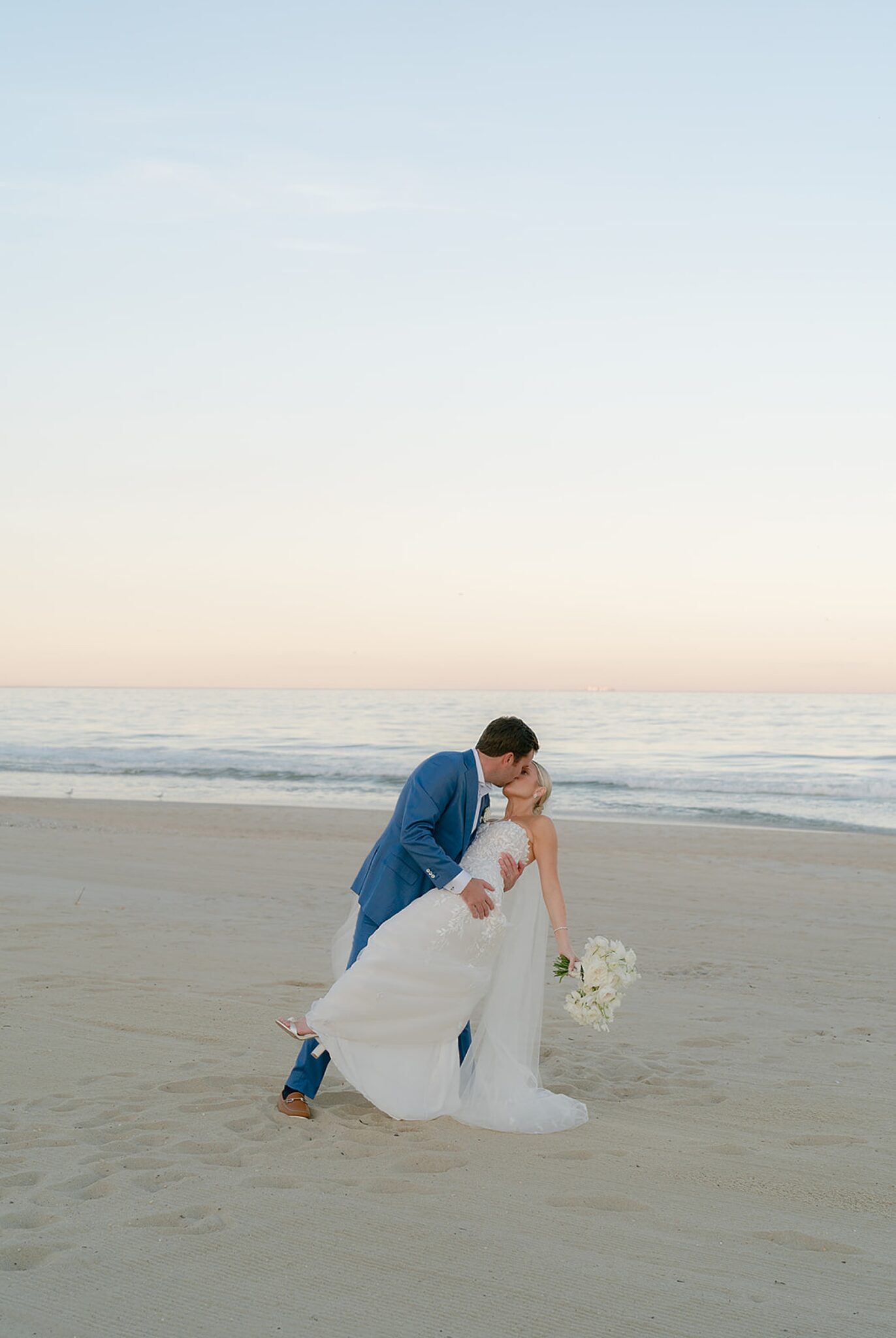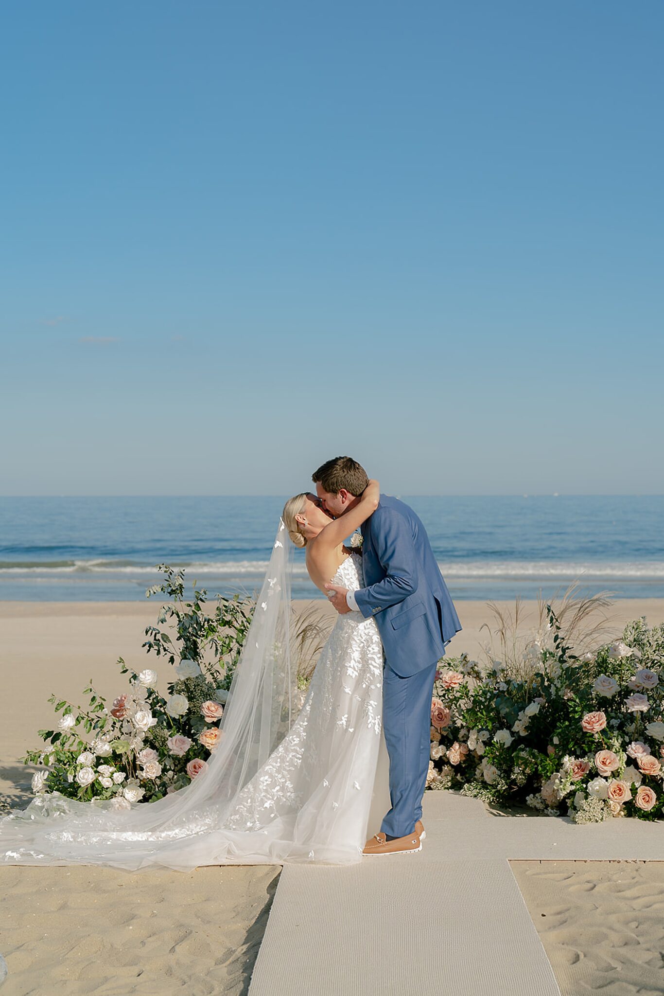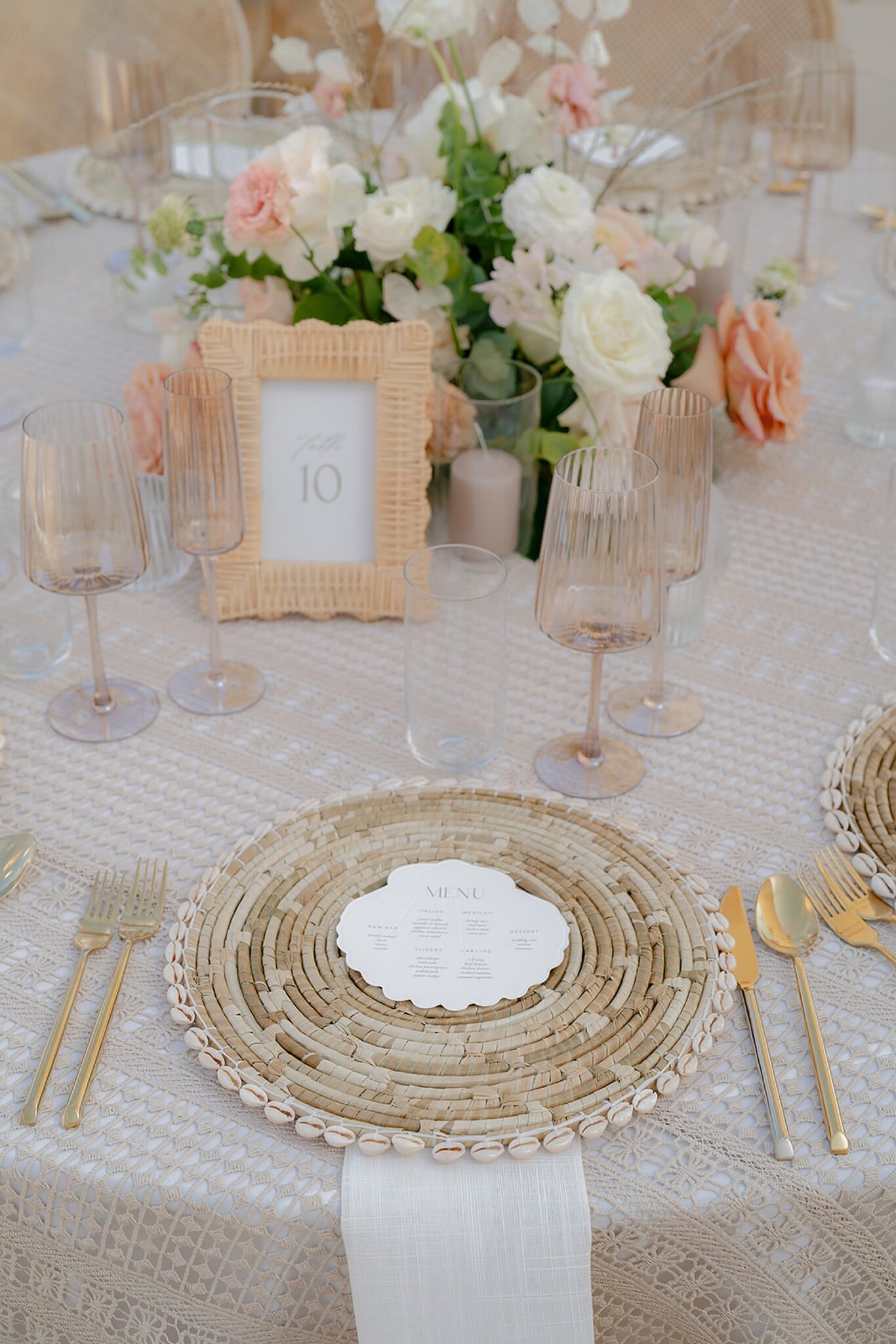 Leaning into the natural landscape of sand and sea, their vision was a relaxed yet refined celebration highlighting a soft, organic palette. Elements of bleached wood, wicker, and scallop shell accents beautifully complemented natural florals and grasses. Their vows were exchanged in a ceremony on the sand, followed by a spectacular oceanfront sunset that painted the evening sky as guests danced under a clear-top tent.