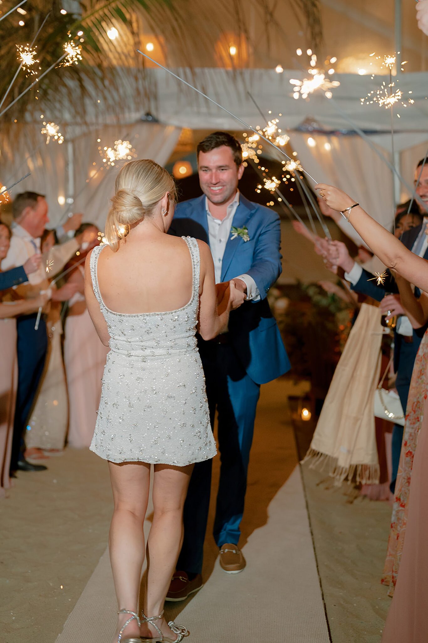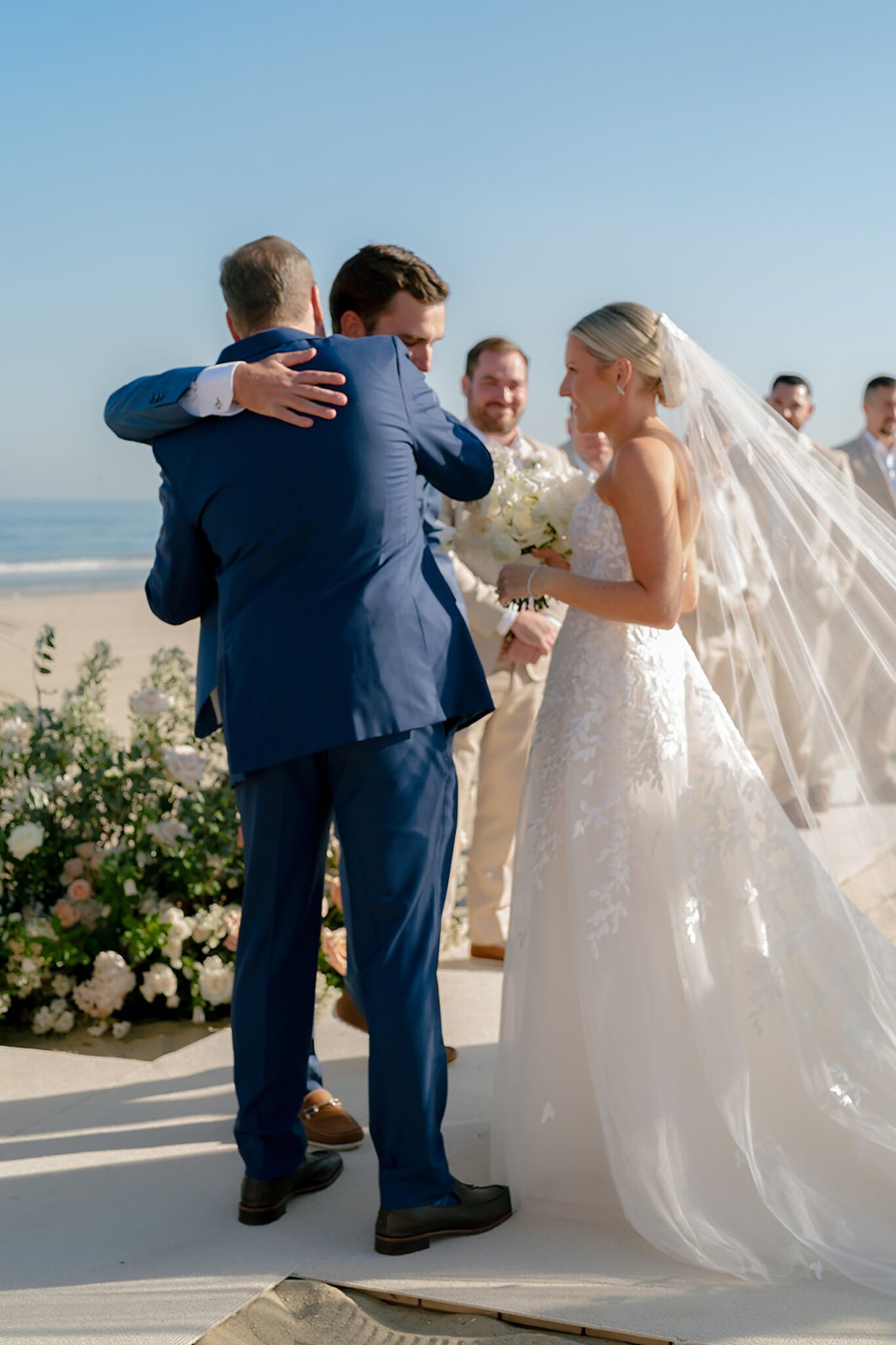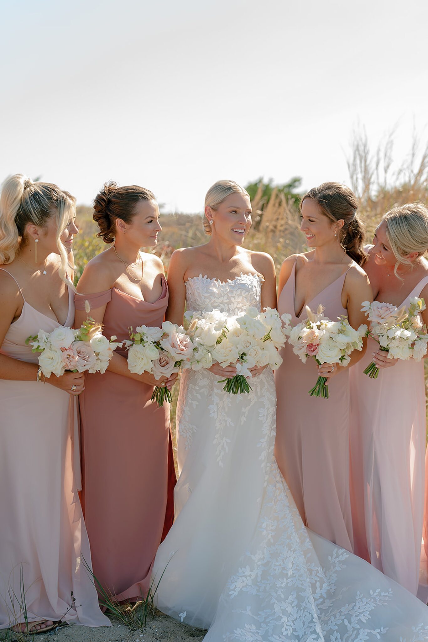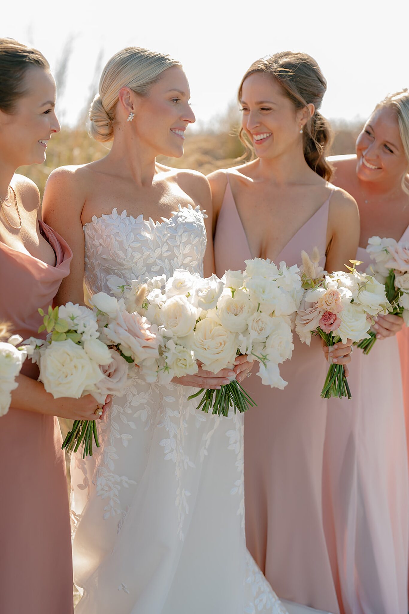 Leaning into the natural landscape of sand and sea, their vision was a relaxed yet refined celebration highlighting a soft, organic palette. Elements of bleached wood, wicker, and scallop shell accents beautifully complemented natural florals and grasses. Their vows were exchanged in a ceremony on the sand, followed by a spectacular oceanfront sunset that painted the evening sky as guests danced under a clear-top tent.