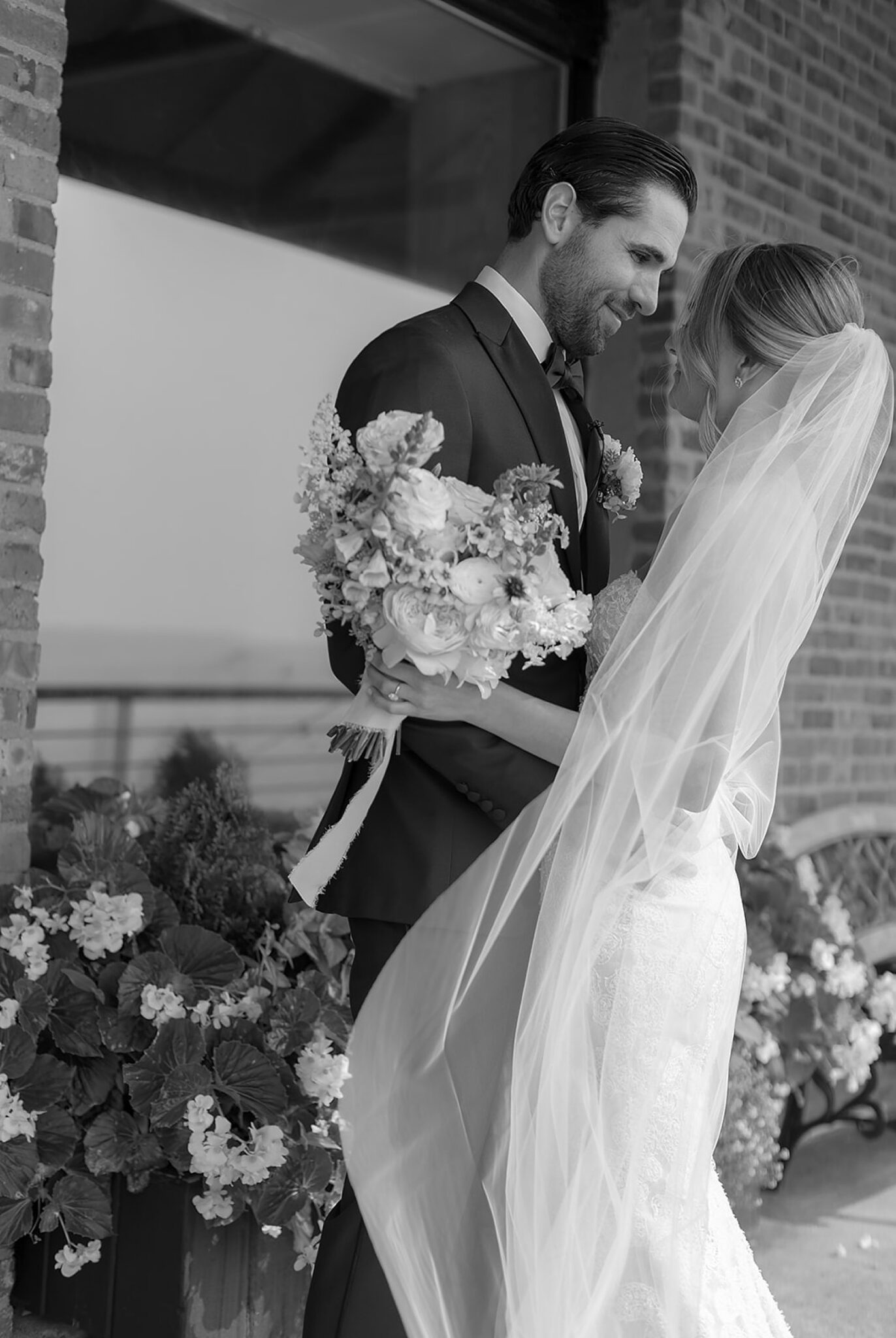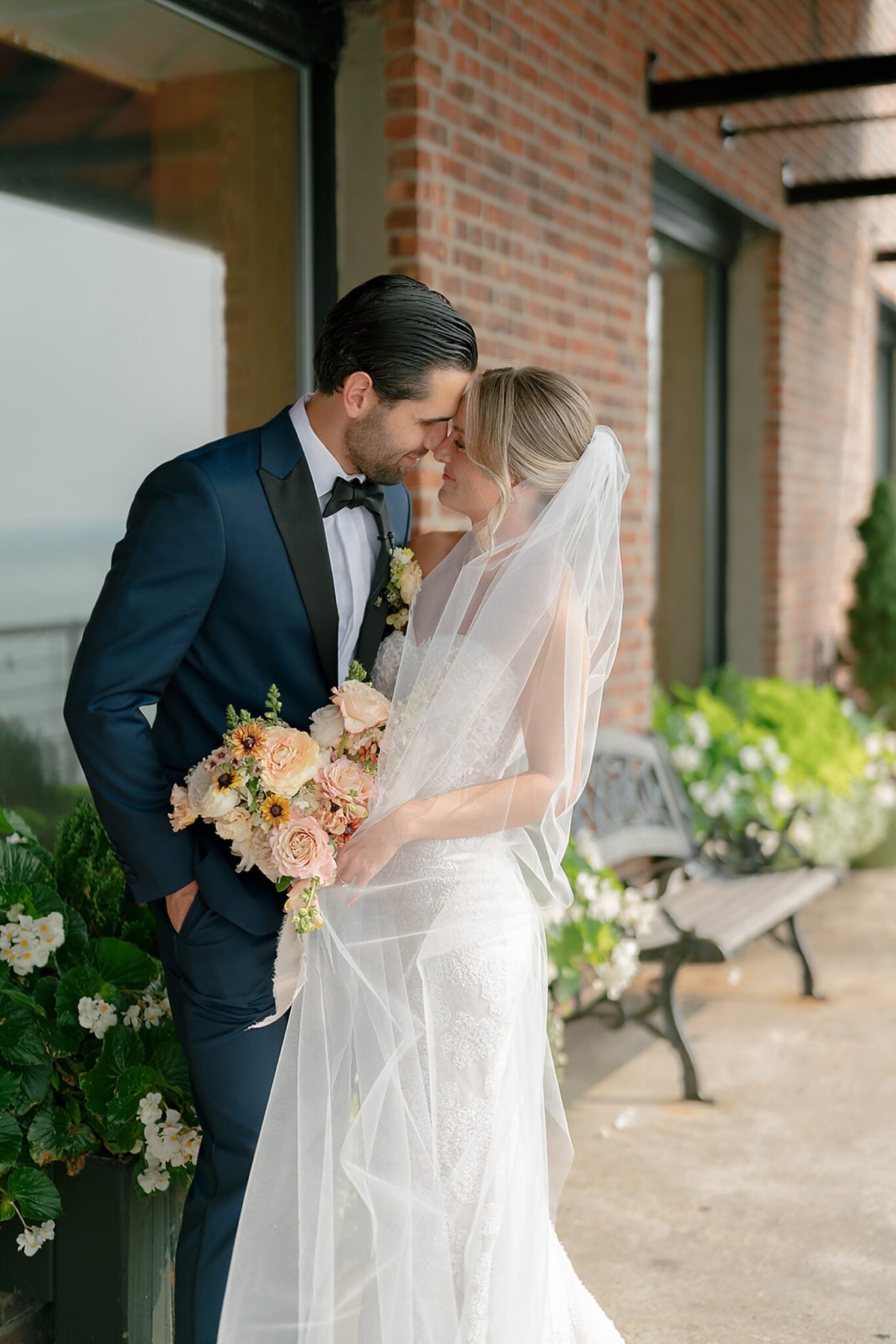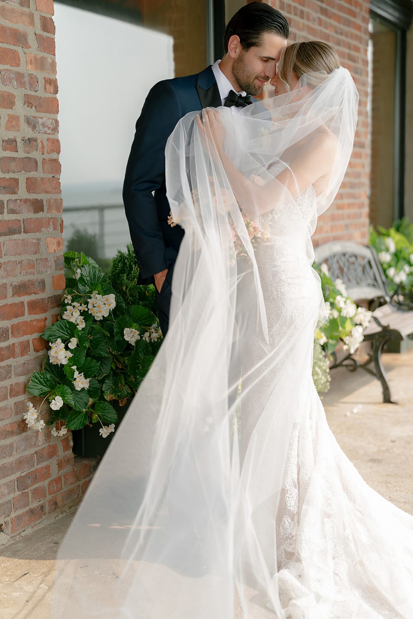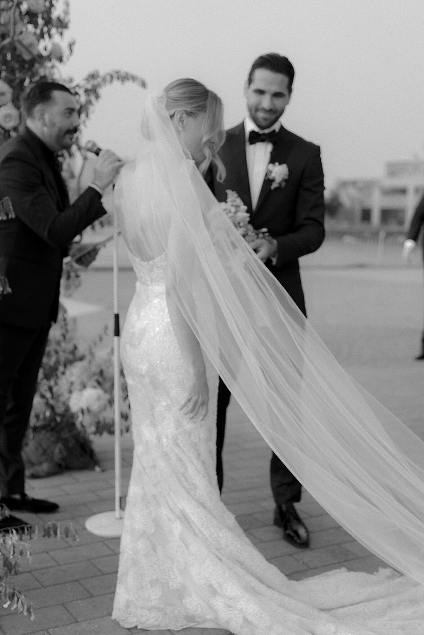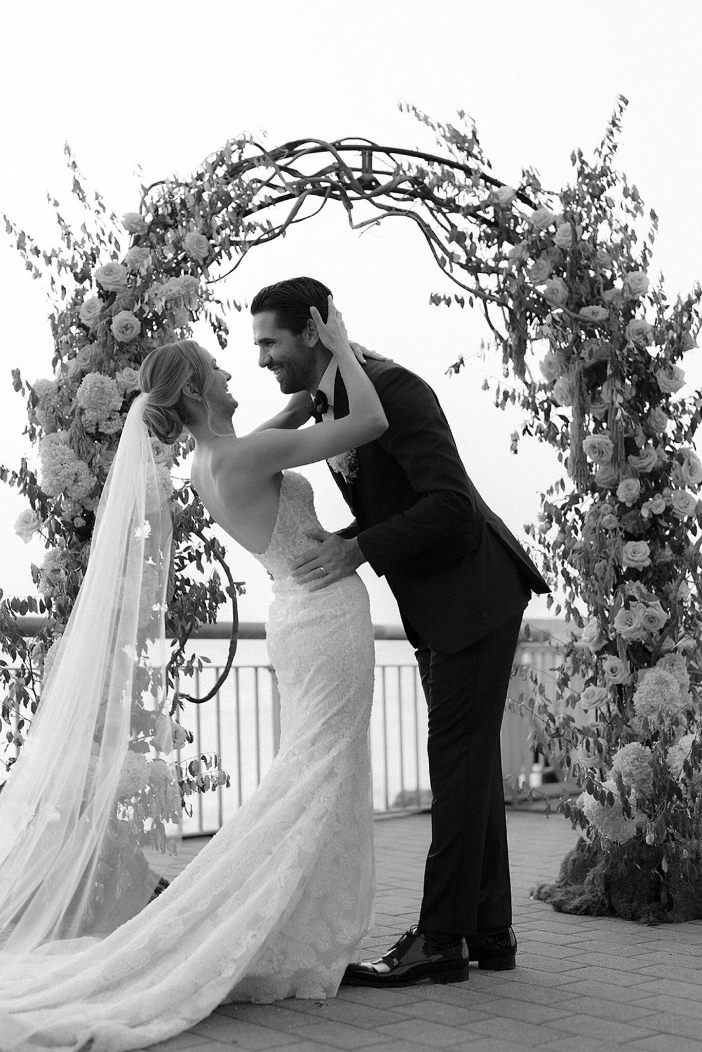 Kelsey stunned in a gown by @mirazwillinger, modern yet romantic in every detail. Rich complemented her look effortlessly in @rothmansnyc, their silhouettes timeless against the cityscape. Florals by Extrafloral Studio brought an editorial edge, sculptural yet organic, weaving texture into the waterfront space.