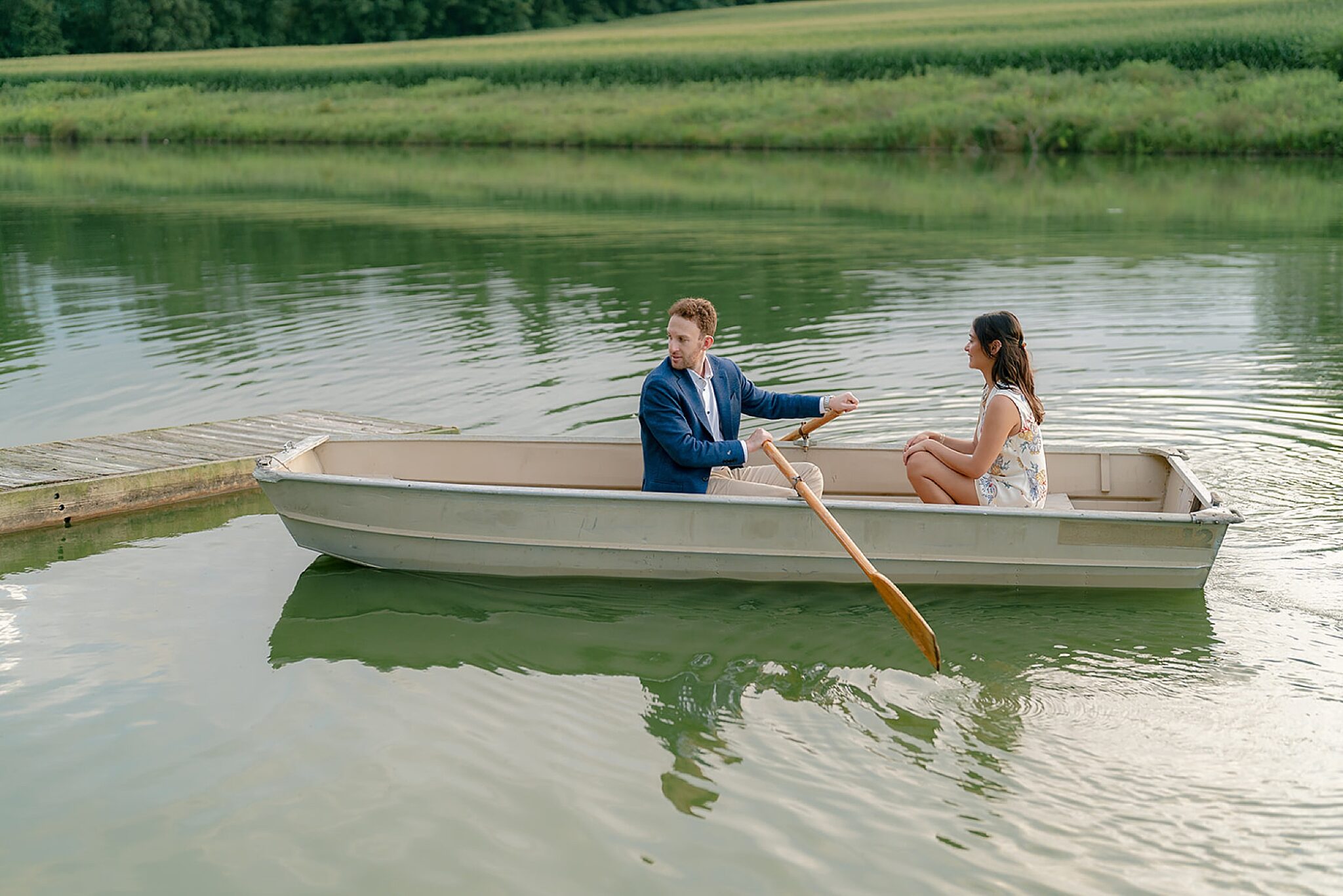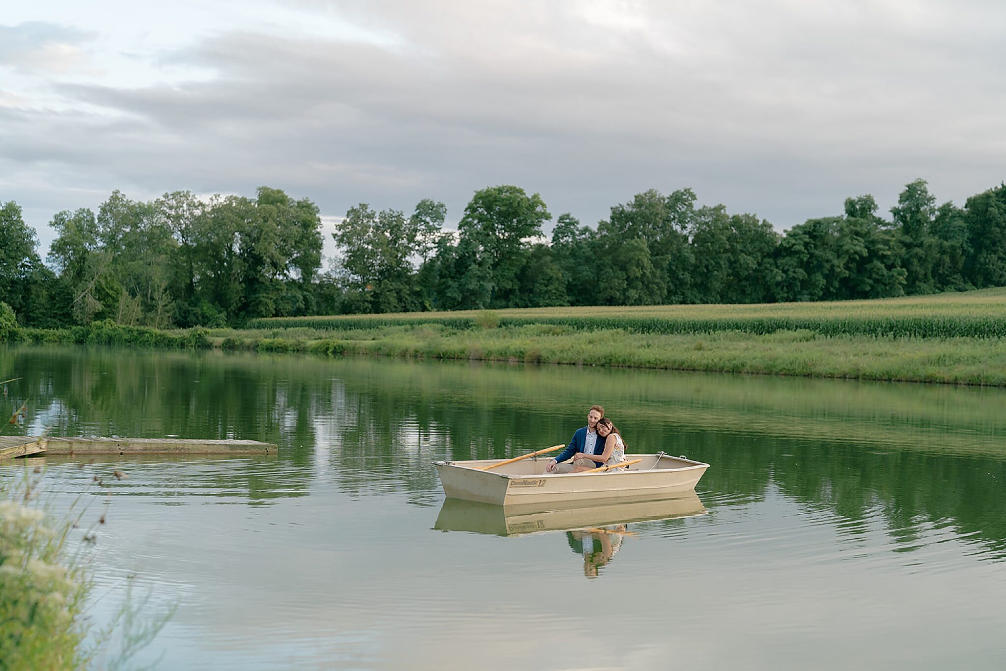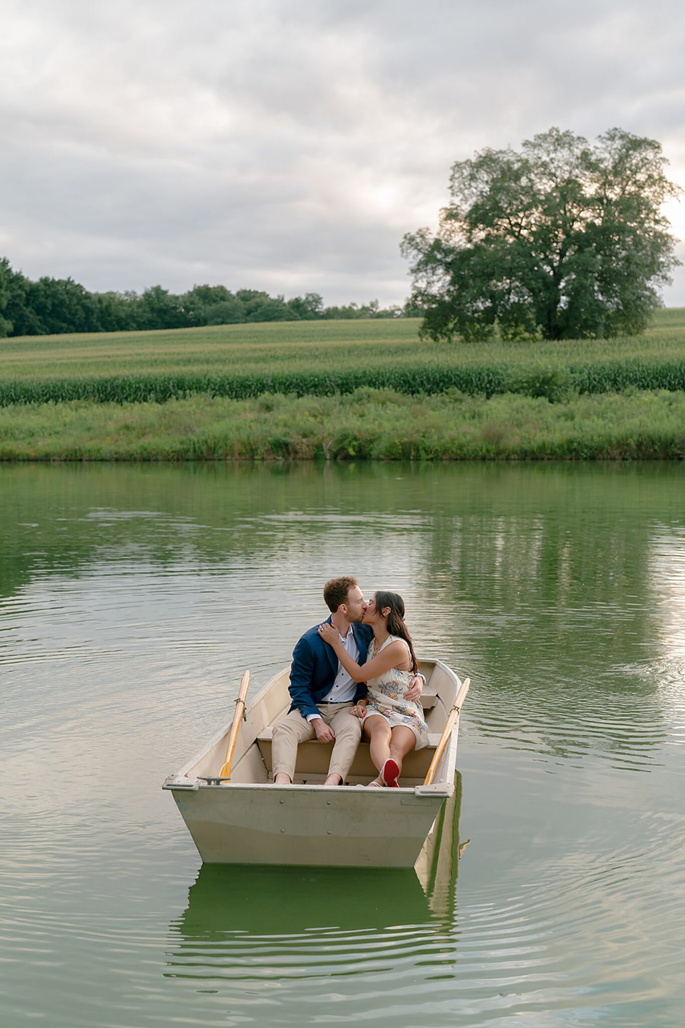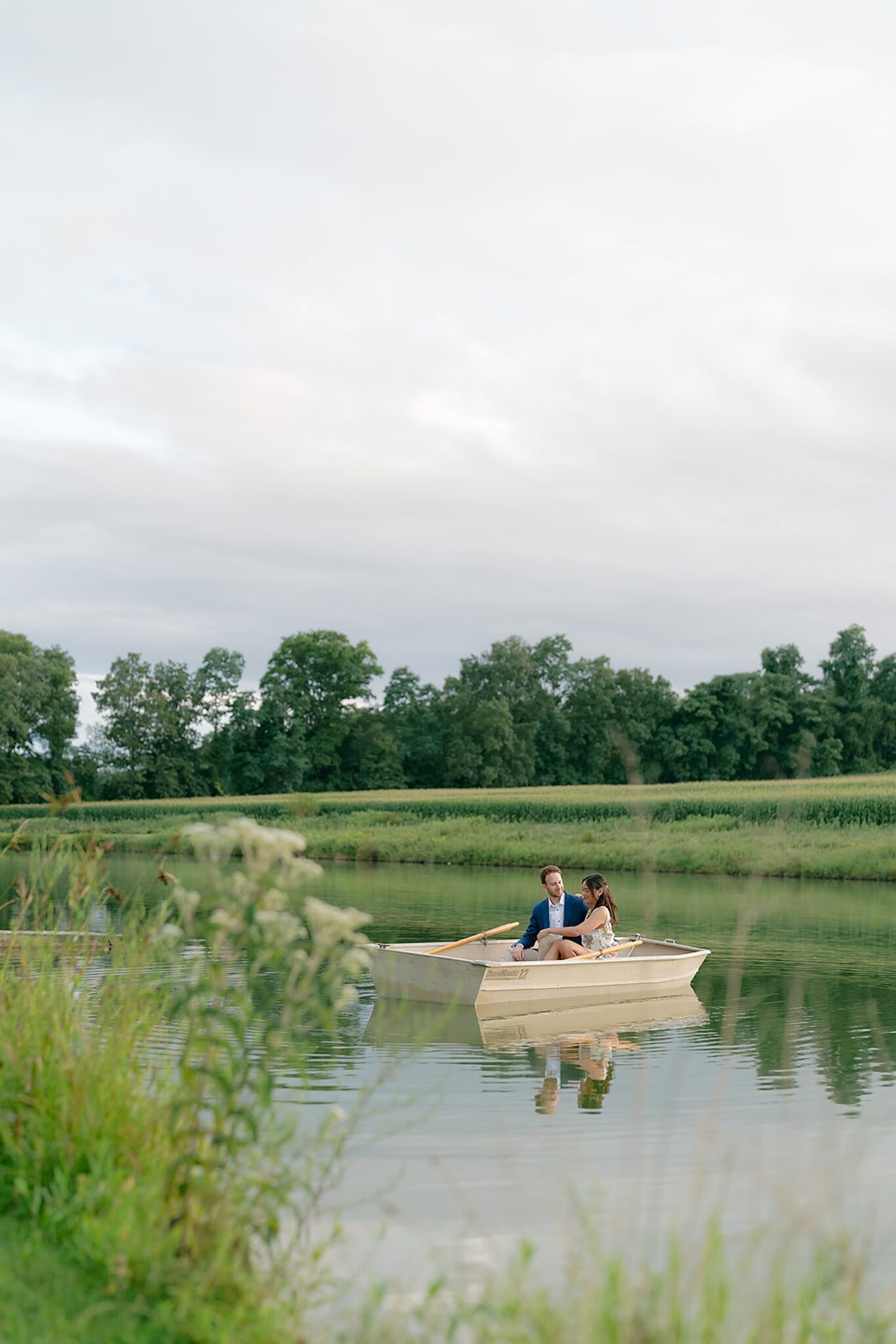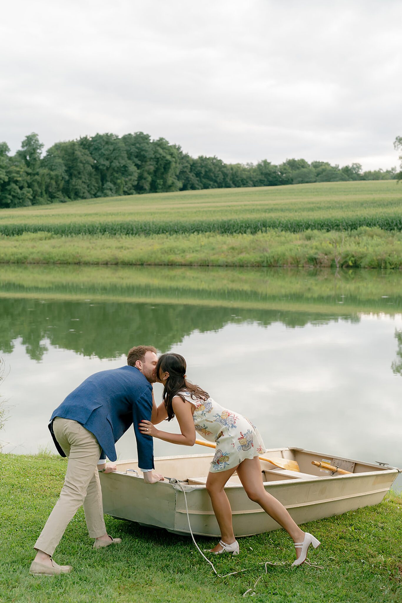 As the evening softened, we traded fields for water. A simple row boat drifted across the lake, evoking a scene straight from The Notebook—refined, cinematic, and timeless. With the stillness of the water and the glow of sunset, the session became both playful and deeply romantic, a portrait of love in its most natural form.