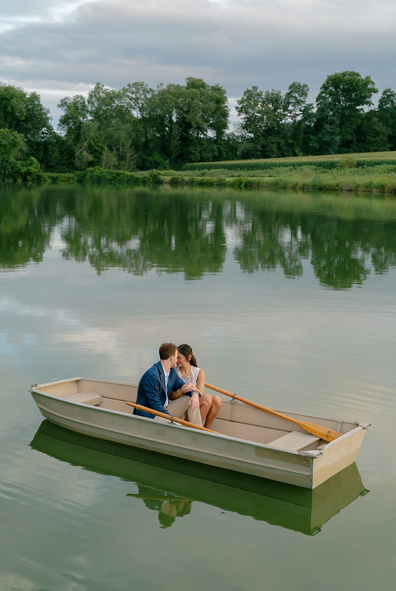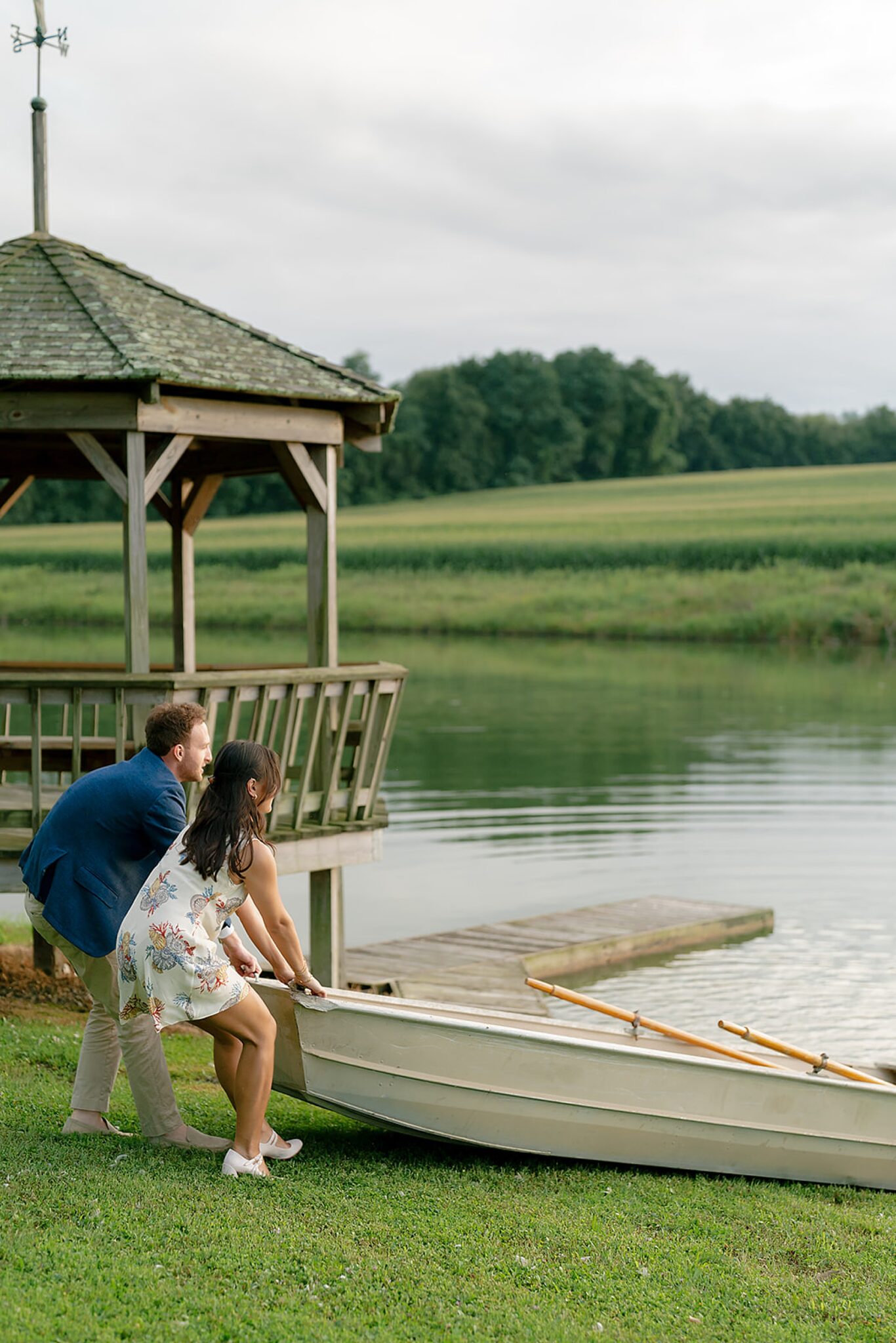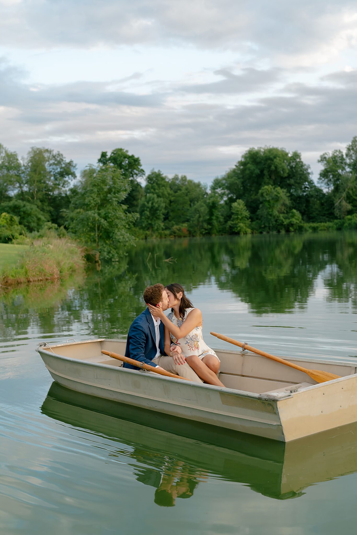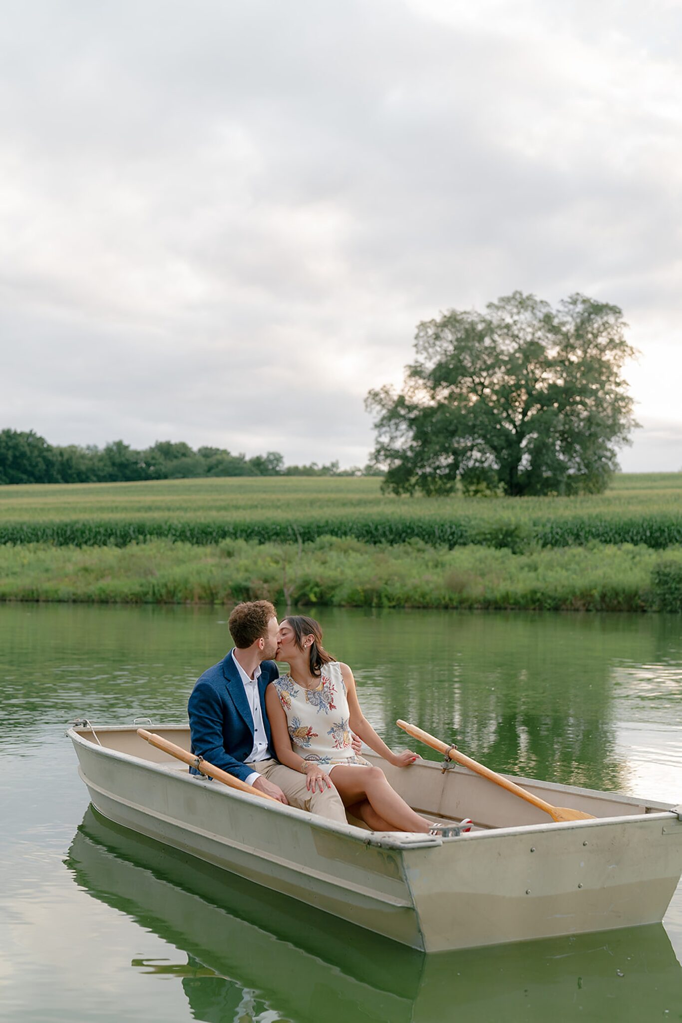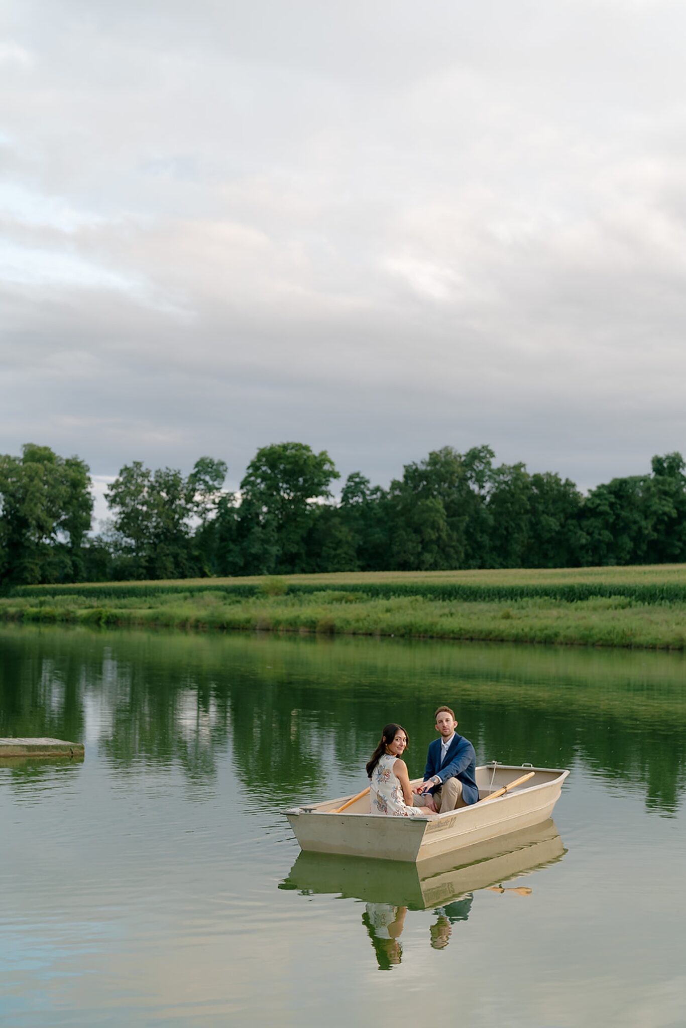 As the evening softened, we traded fields for water. A simple row boat drifted across the lake, evoking a scene straight from The Notebook—refined, cinematic, and timeless. With the stillness of the water and the glow of sunset, the session became both playful and deeply romantic, a portrait of love in its most natural form.