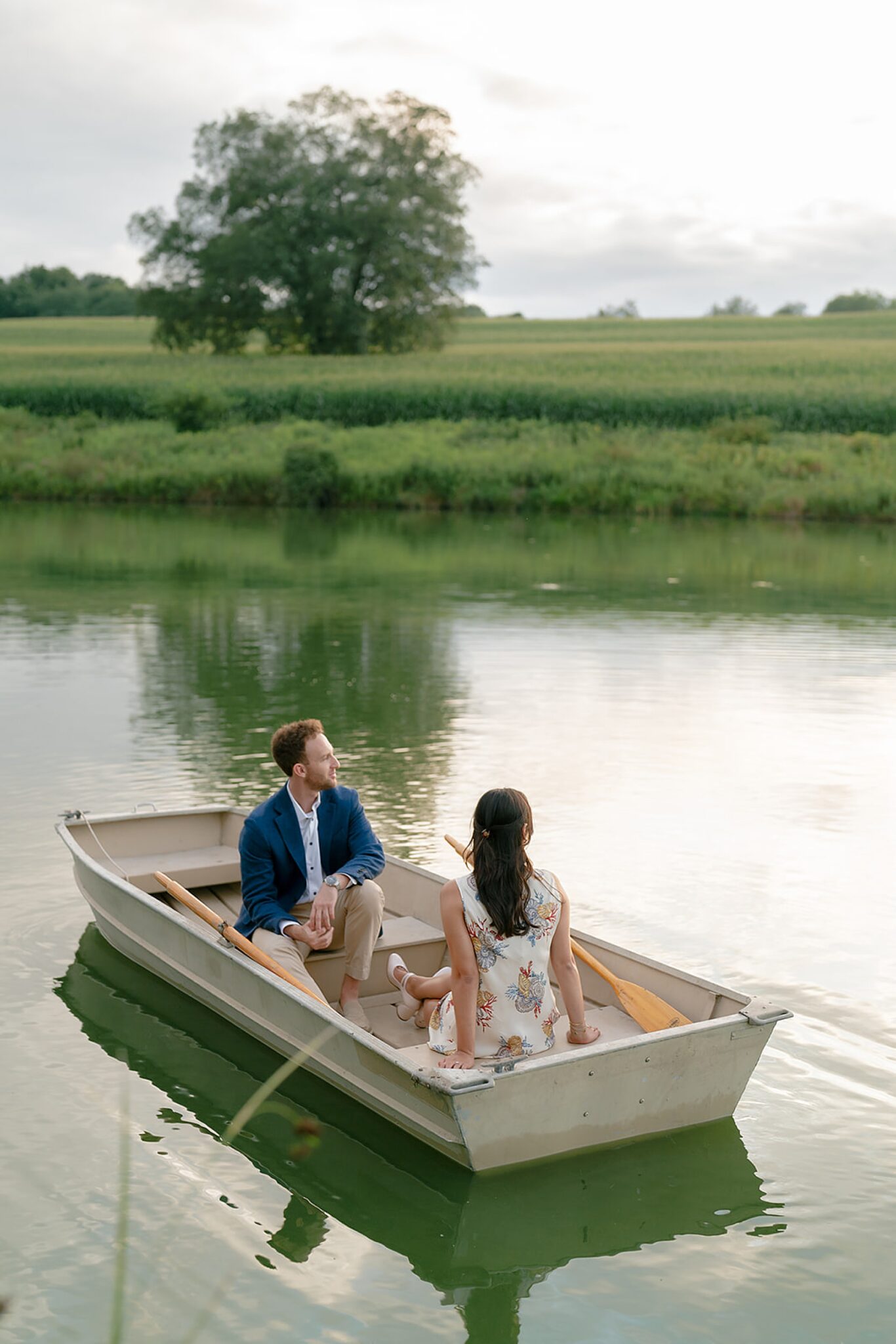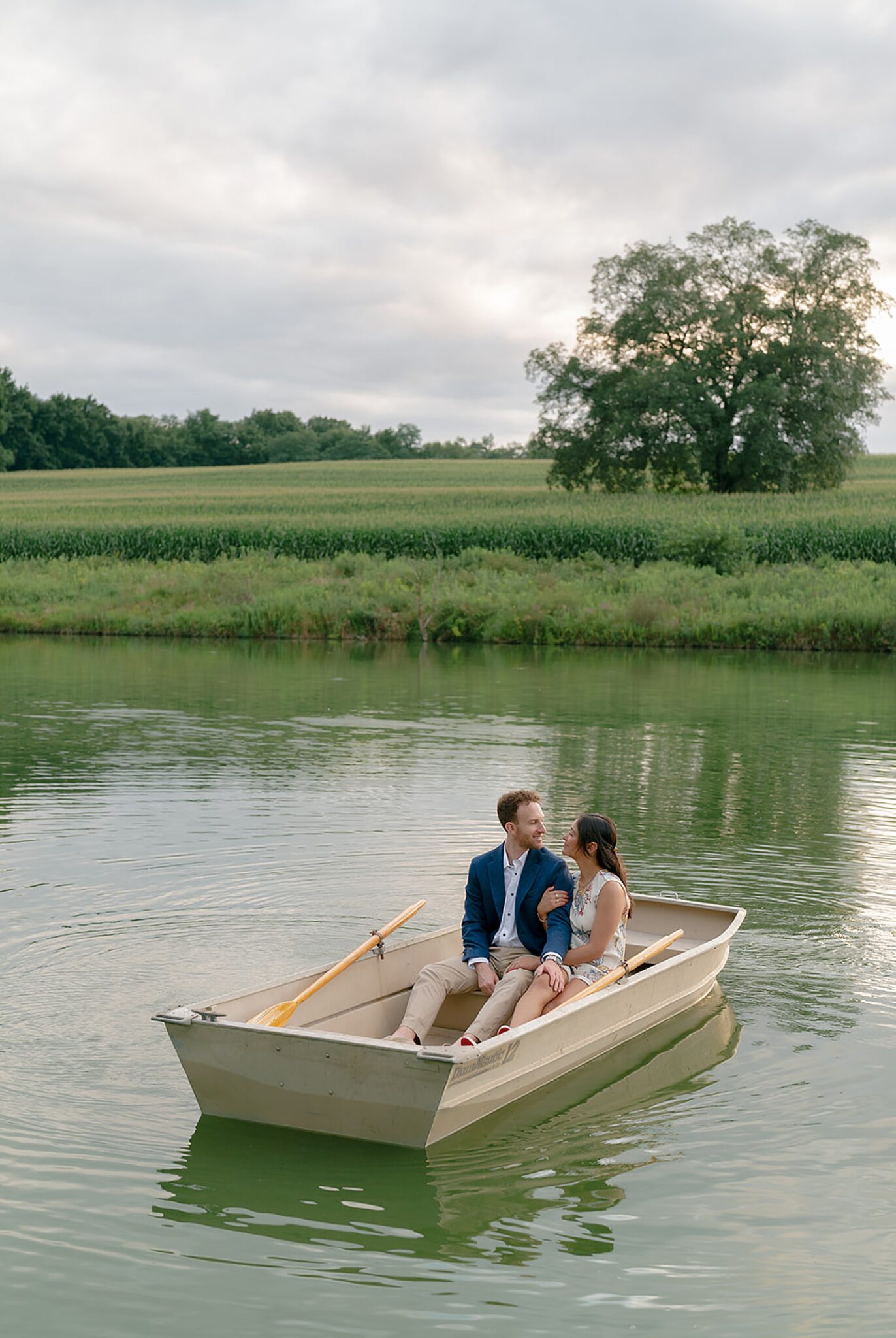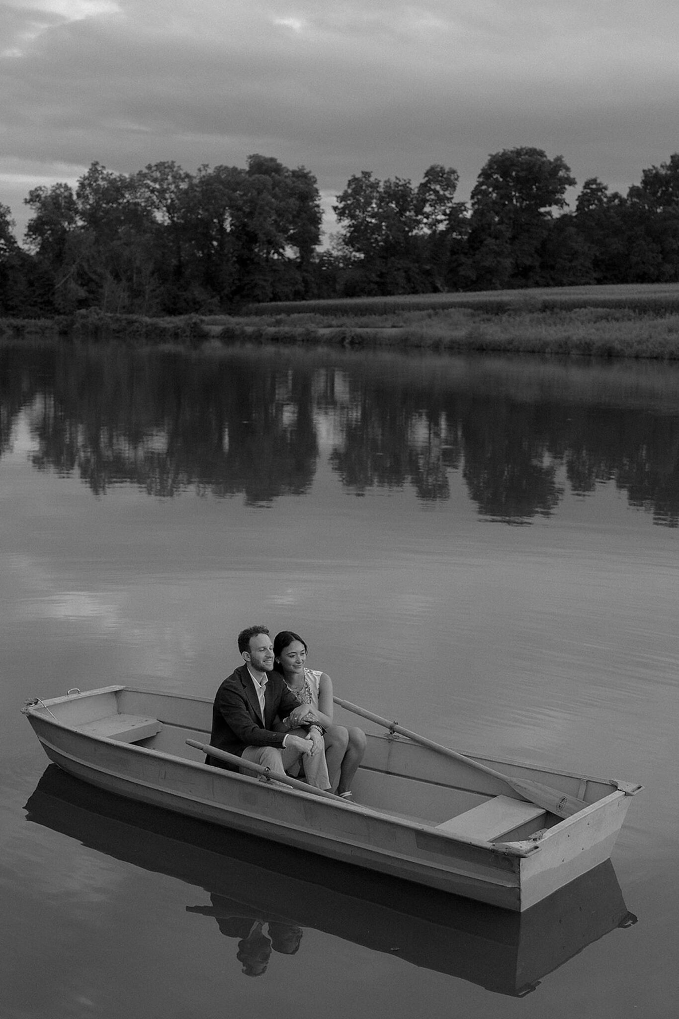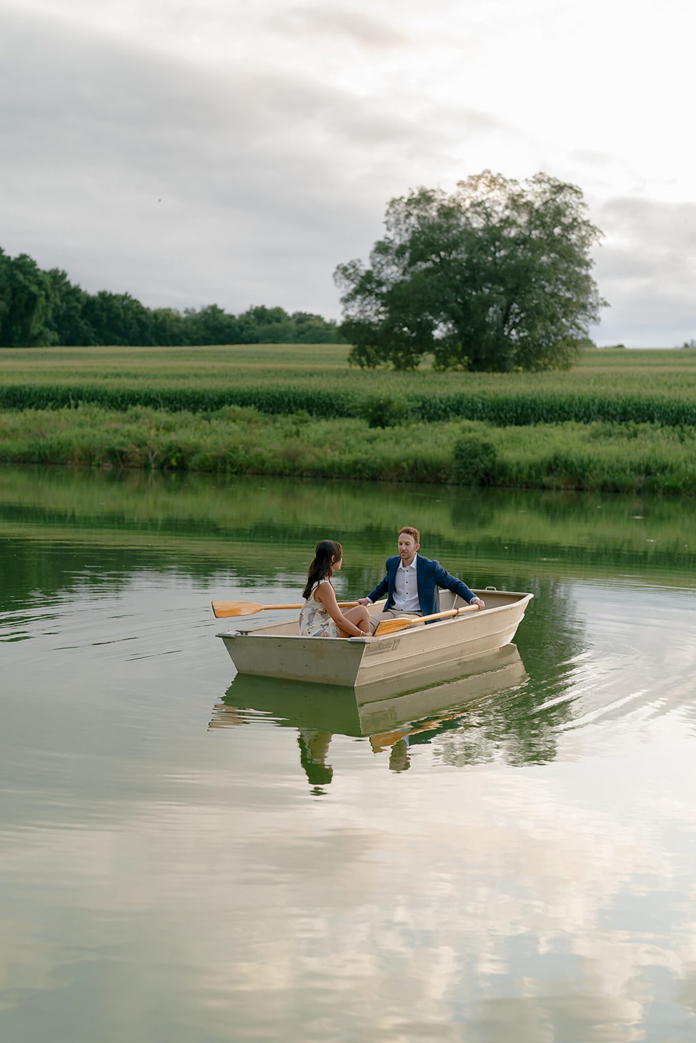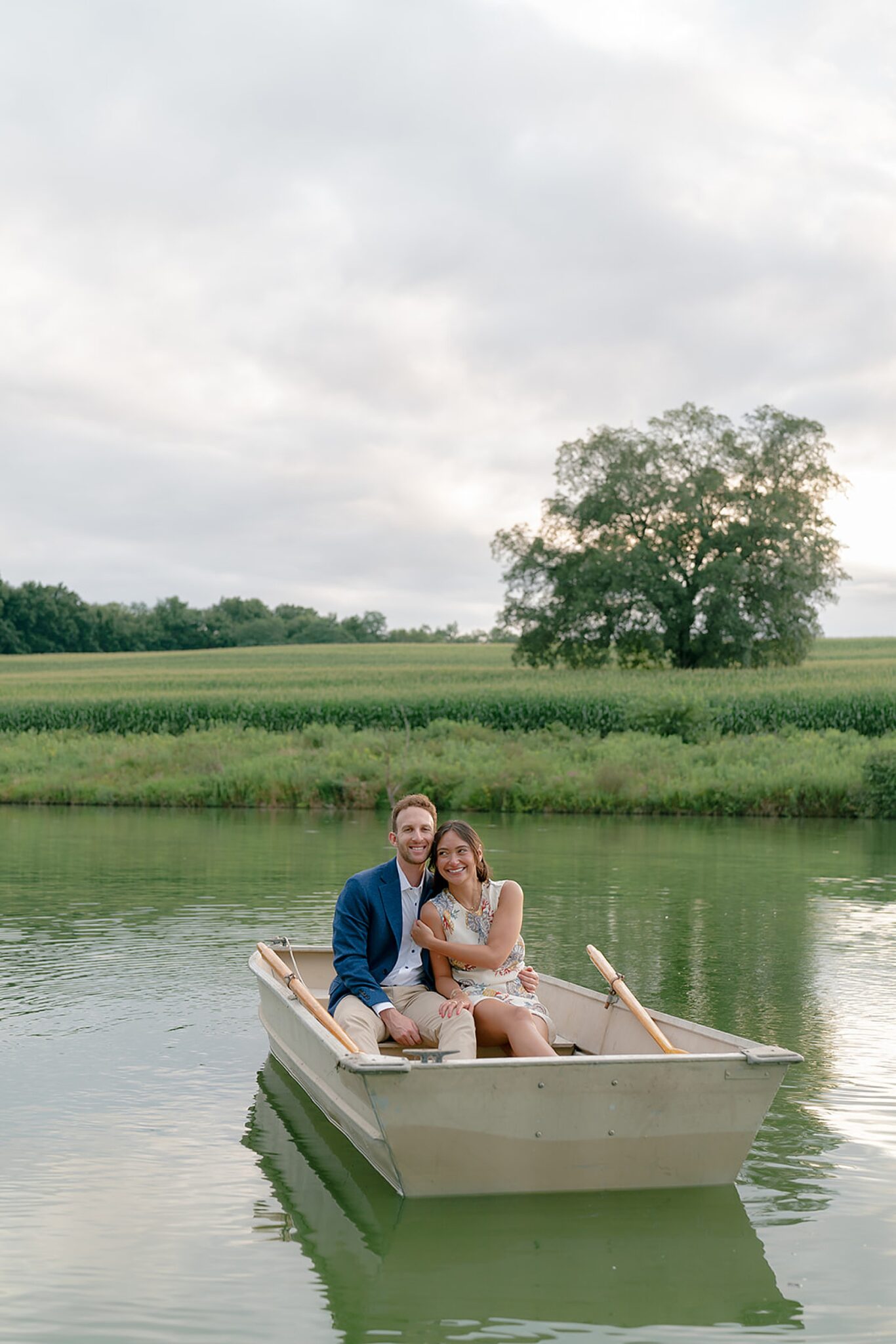 As the evening softened, we traded fields for water. A simple row boat drifted across the lake, evoking a scene straight from The Notebook—refined, cinematic, and timeless. With the stillness of the water and the glow of sunset, the session became both playful and deeply romantic, a portrait of love in its most natural form.