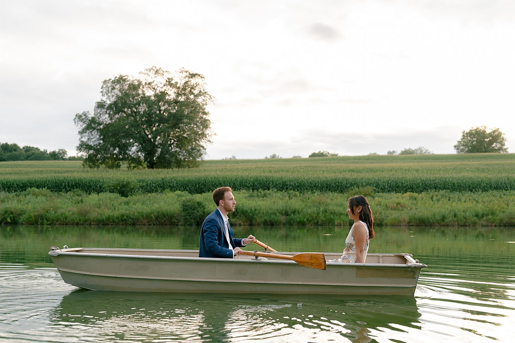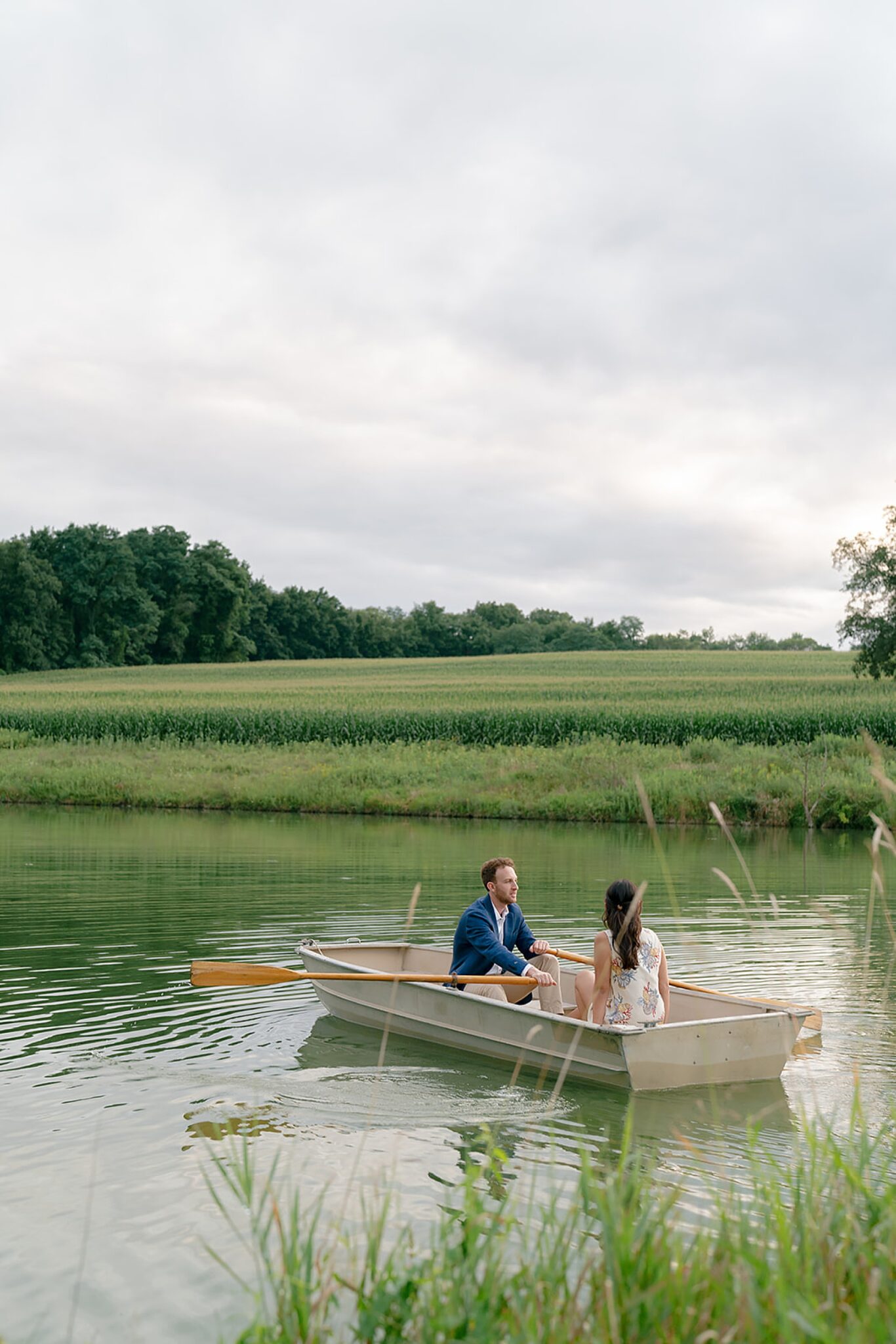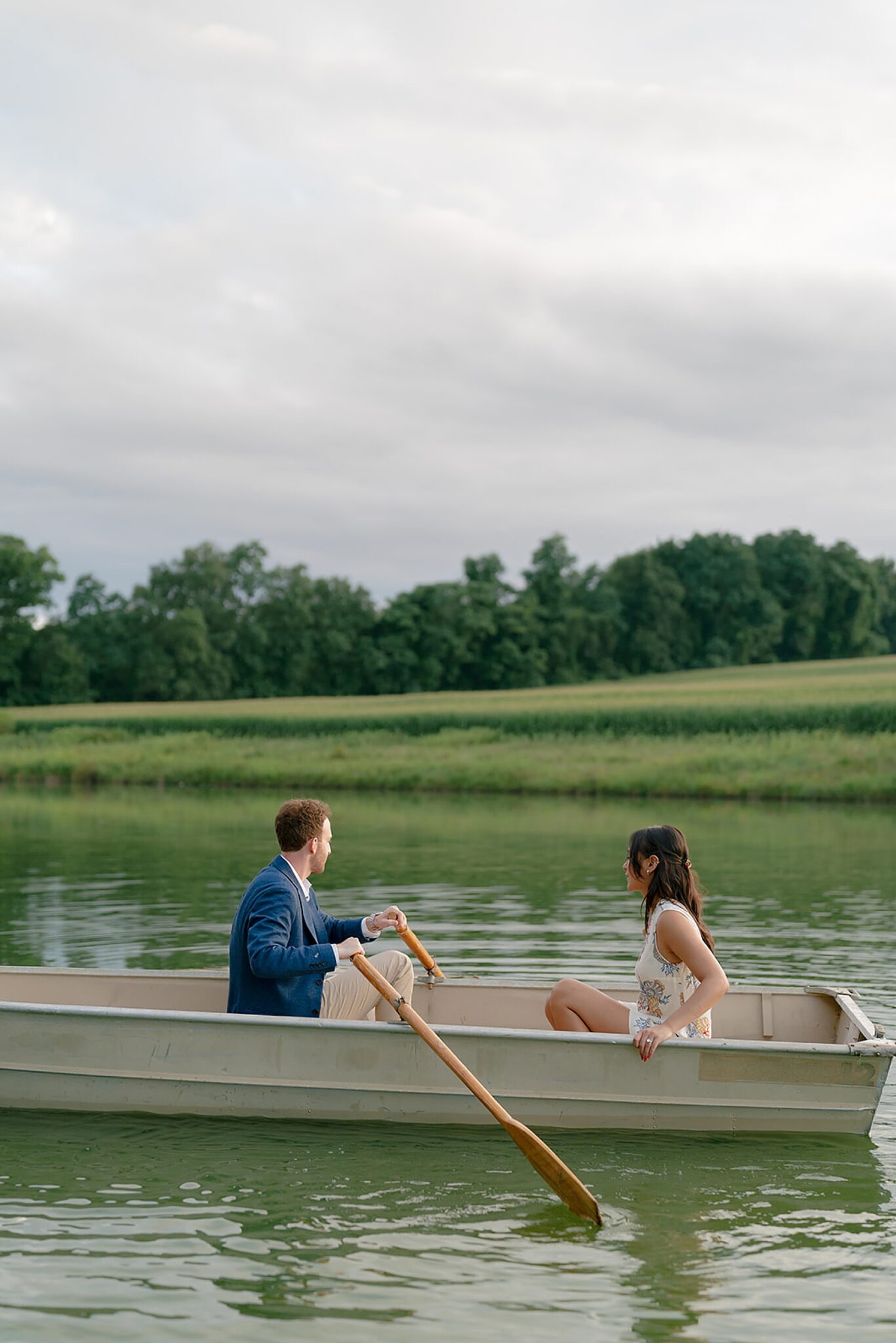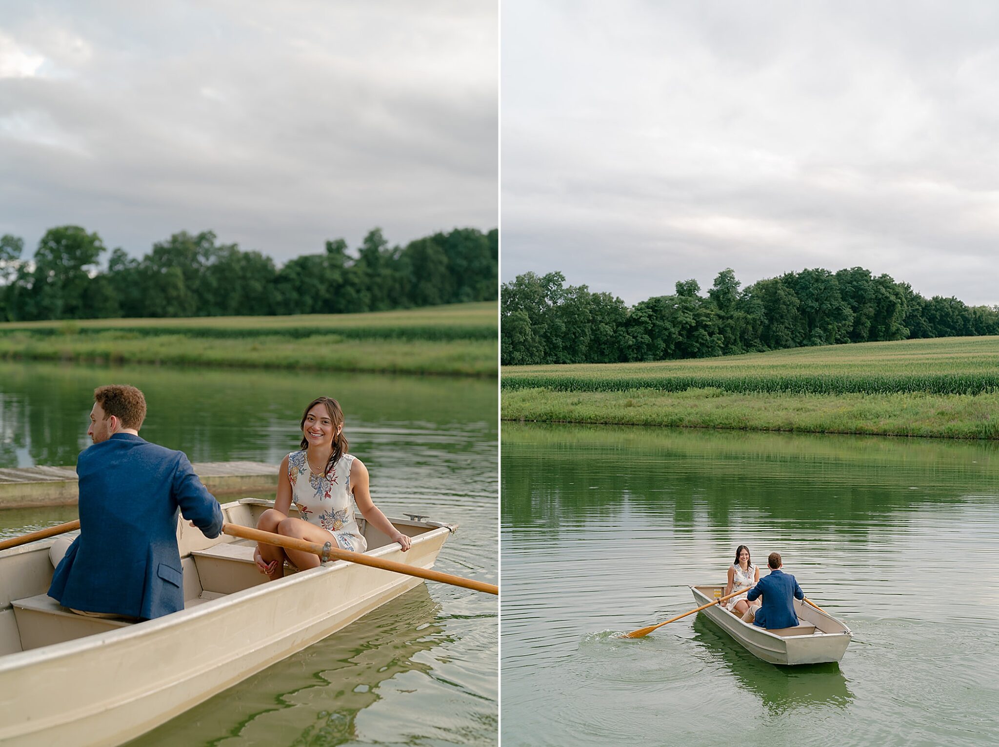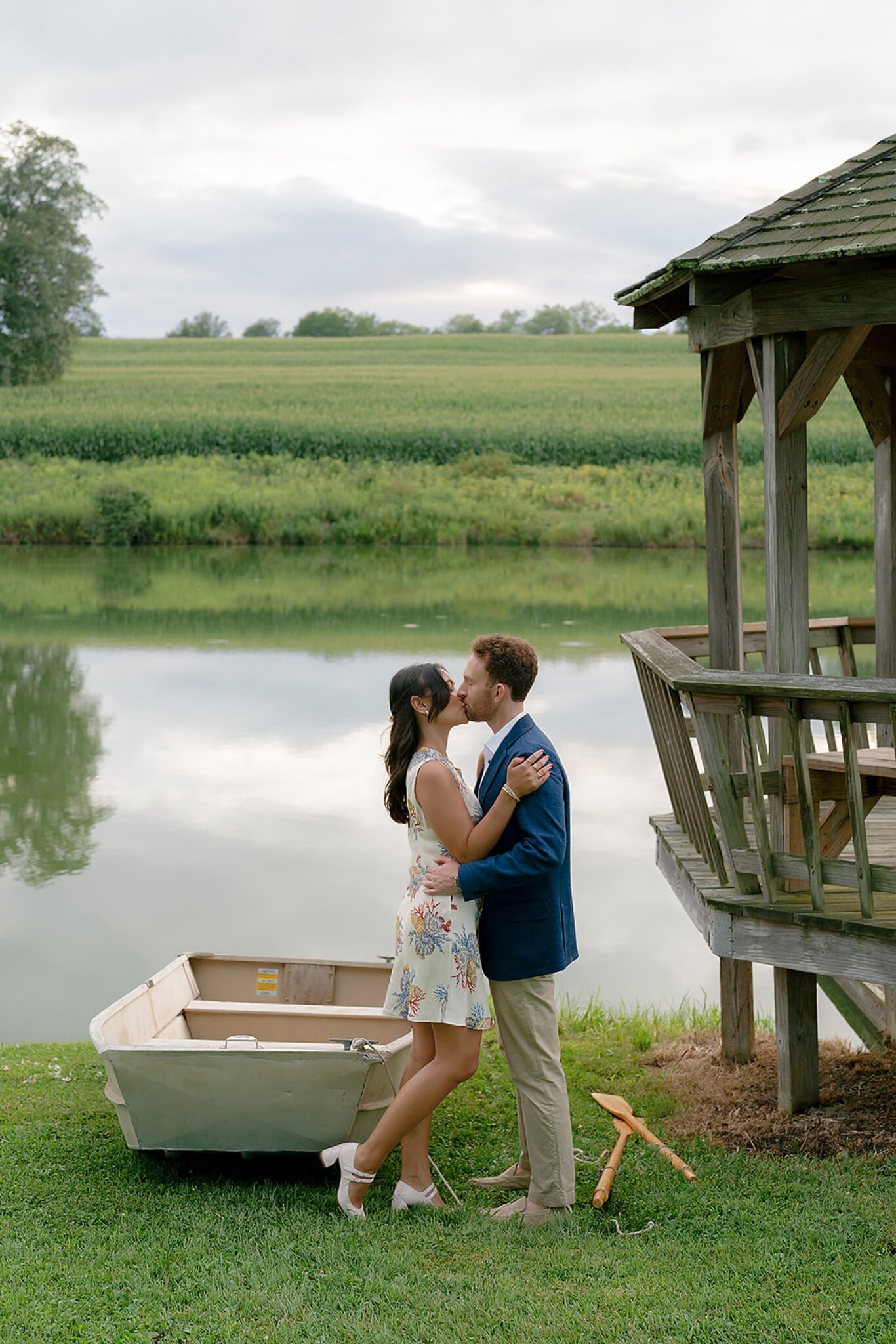 As the evening softened, we traded fields for water. A simple row boat drifted across the lake, evoking a scene straight from The Notebook—refined, cinematic, and timeless. With the stillness of the water and the glow of sunset, the session became both playful and deeply romantic, a portrait of love in its most natural form.