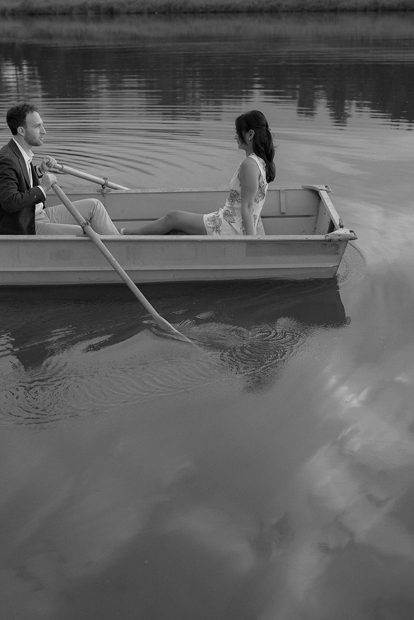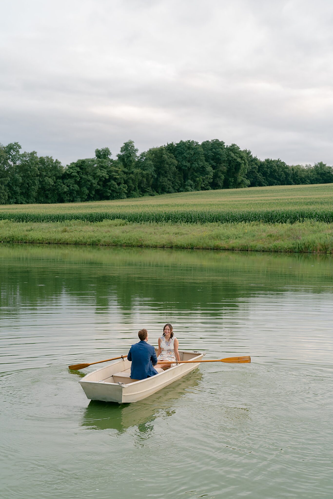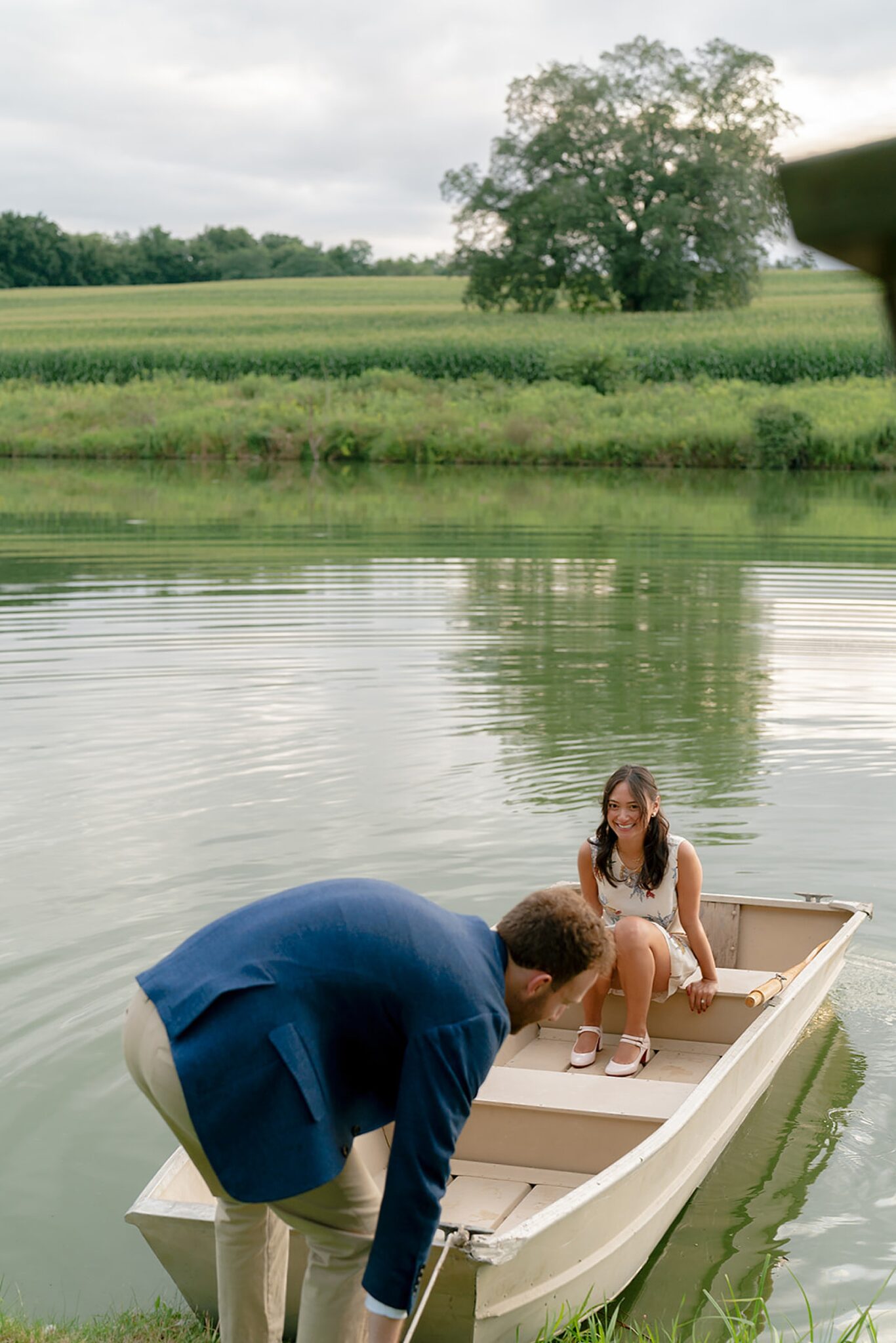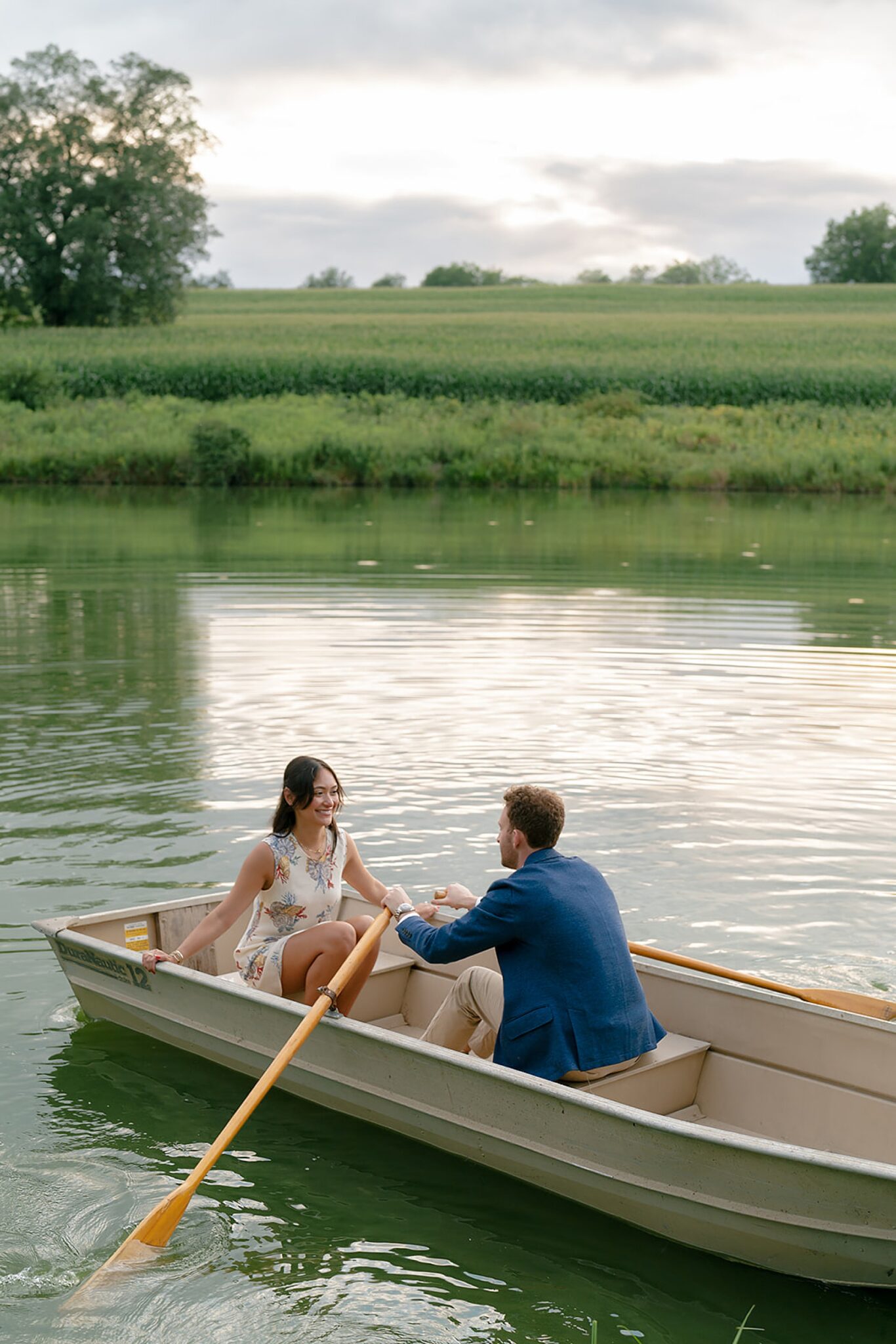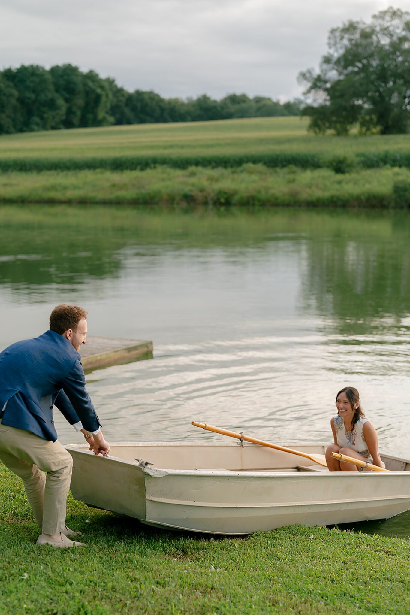 As the evening softened, we traded fields for water. A simple row boat drifted across the lake, evoking a scene straight from The Notebook—refined, cinematic, and timeless. With the stillness of the water and the glow of sunset, the session became both playful and deeply romantic, a portrait of love in its most natural form.