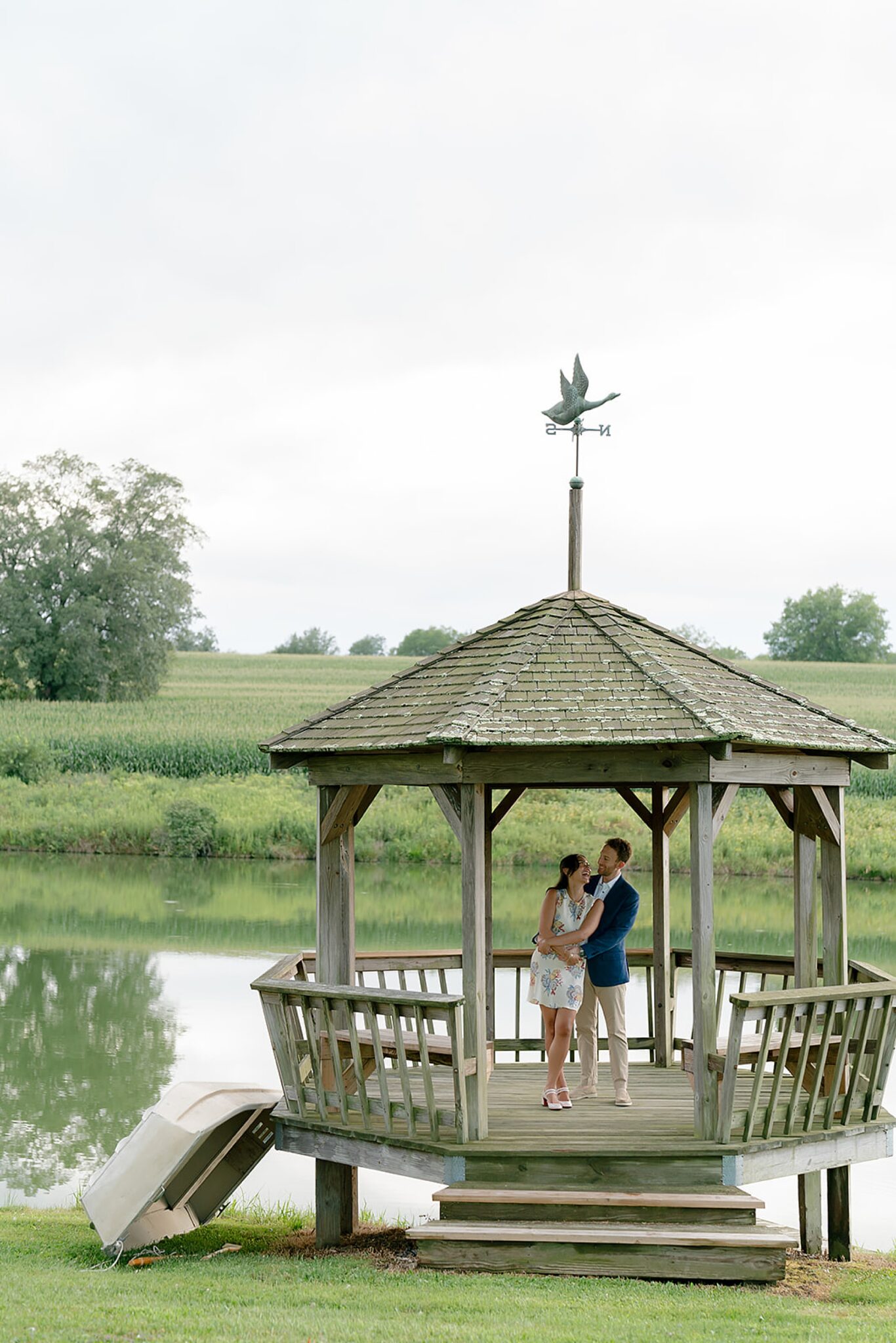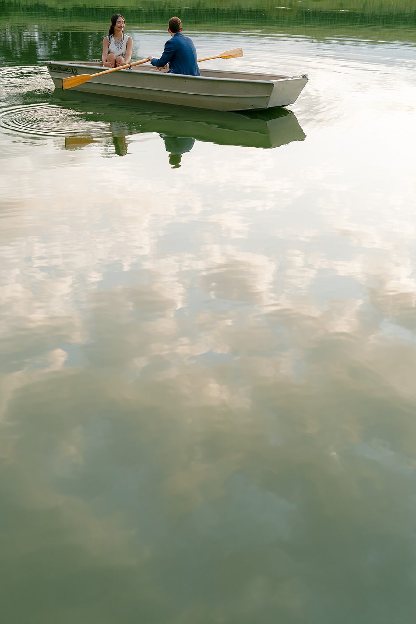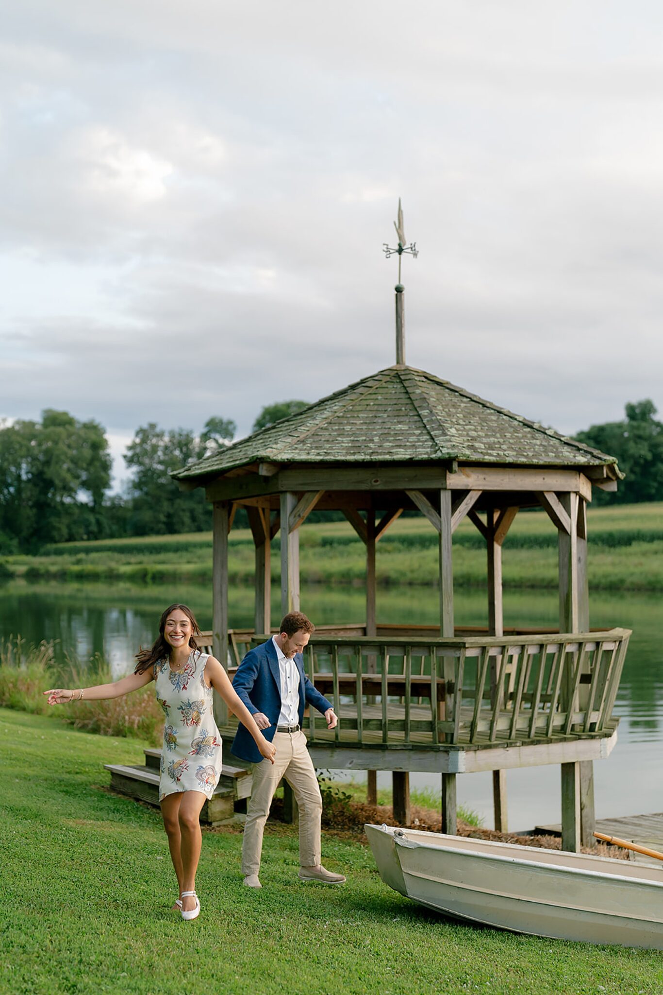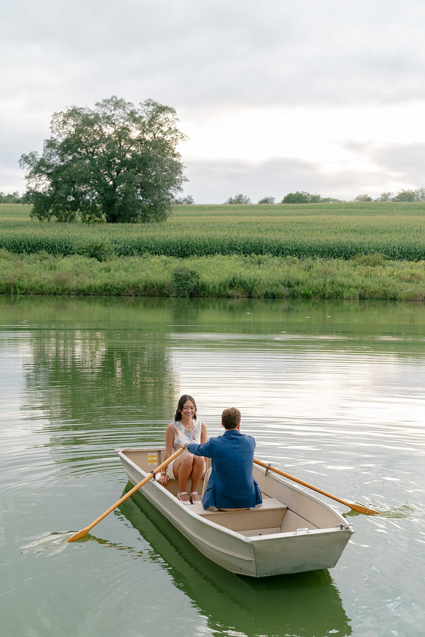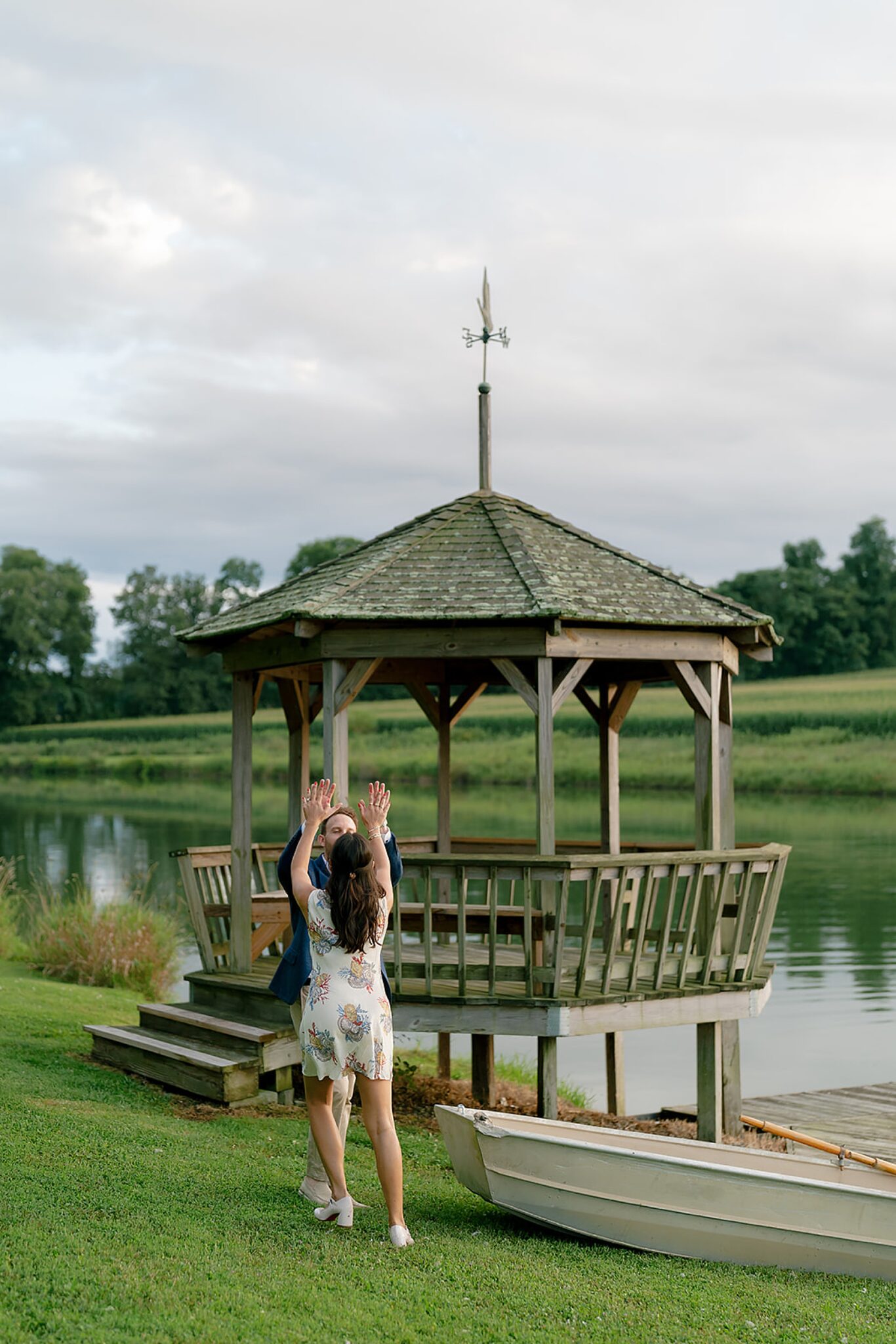 As the evening softened, we traded fields for water. A simple row boat drifted across the lake, evoking a scene straight from The Notebook—refined, cinematic, and timeless. With the stillness of the water and the glow of sunset, the session became both playful and deeply romantic, a portrait of love in its most natural form.