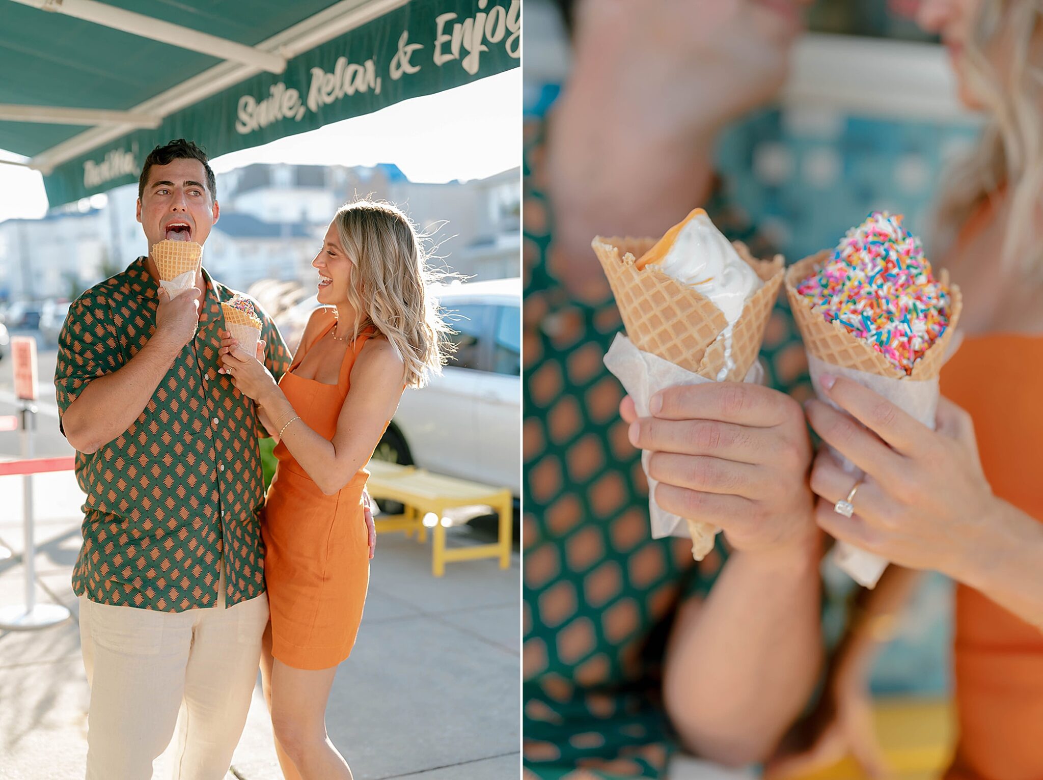 Sammie and Sagee’s engagement session was the perfect blend of playful and romantic. We began at a bright, retro-inspired ice cream shop in Margate, where bold colors, funky 70s vibes, and their pup in tow set the tone for a session full of personality. It was lighthearted, stylish, and uniquely them.